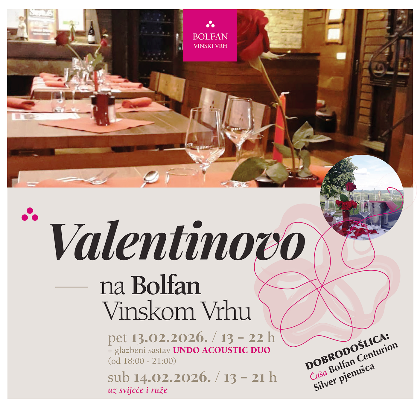 Pozivamo Vas na Valentinovo uz ruže i svijeće u prekrasnom Hrvatskom Zagorju na Bolfan Vinskom Vrhu u petak 13. i subotu 14.02.2026. U petak glazba Undo Acoustic duo.